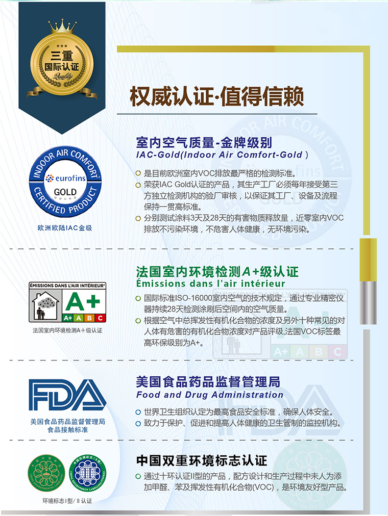 依據GB 1741-2007標準對耐霉菌性能測試,針對常見的霉菌如,黑曲霉,黃曲霉、出芽短梗霉、綠色木霉、臘葉芽枝霉、宛氏擬青霉、球毛殼霉、桔青霉等8種霉菌能達到“0級防霉”(0級為該標準中防霉性能判定的最高等級)的功能。針對潮濕墻面、霉菌滋生能發揮抑制作用,呵護墻面效果歷久彌新,一漆告別多種墻面問題,輕松打造無憂居室環境。