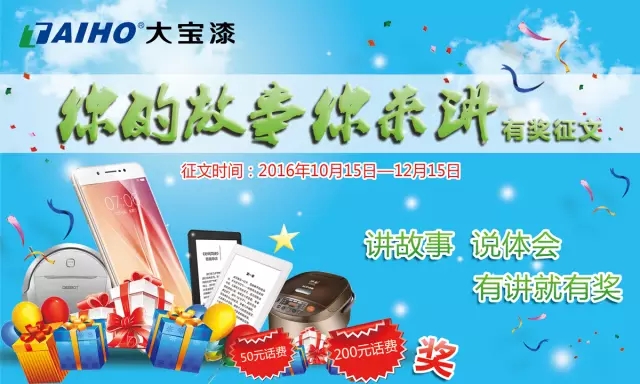 為更好地促進(jìn)大寶漆各經(jīng)銷商同仁間的交流與互助,讓經(jīng)銷商同仁分享成功的經(jīng)驗(yàn),通過(guò)分享市場(chǎng)第一線員工的成功案例及心得體驗(yàn),并以此作為學(xué)習(xí)楷模,取其智慧精華,促使各地經(jīng)銷商同仁互補(bǔ)優(yōu)勢(shì)、共同提升,故大寶漆官方微信和大寶報(bào)聯(lián)合主辦“你的故事你來(lái)講”有獎(jiǎng)?wù)魑幕顒?dòng)。
